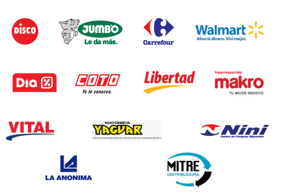 Entre nuestros clientes se encuentran Disco, Jumbo, Dia, Walmart, Carrefour, Makro, Vital, Yaguar, Nini, Coto y Libertad de Córdoba.